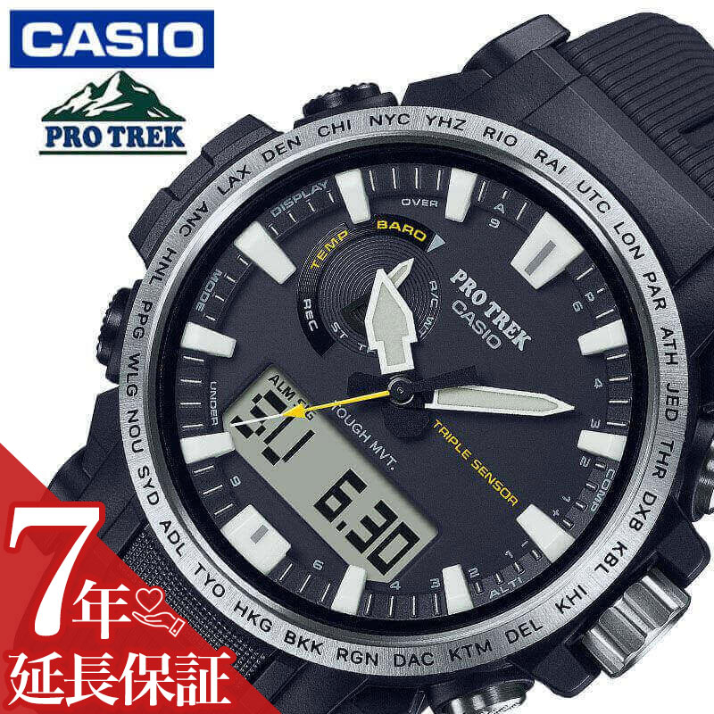 型番PRW-61-1AJFケース材質:樹脂/ステンレススチールサイズ約:縦51×横47.4mm×厚:14.7mm重:53gベルト材質:デュラソフトバンド(シリコーン樹脂)カラー:ブラックベルト腕周り最少:14.5cmベルト腕周り最大:21.5cmムーブメント電波ソーラークォーツ機能10気圧防水電波時計 日本・北米・ヨーロッパ・中国地域対応 MULTIBAND6高度計測機能/相対高度計(計測範囲:−700〜10,000m、1m単位)、高度差インジケーター(計測範囲1:100m/5m単位、計測範囲2:1000m/50m単位)、高度傾向グラフ、計測間隔設定機能(5秒/2分毎)※最初の3分間のみ1秒毎、高度メモリー(計測年月日・時刻・高度を最大30本マニュアルメモリー)、自動記録データ(最高/最低高度、オート積算(上昇/下降)メモリー)気圧計測機能(計測範囲:260〜1,100hPa、1hPa単位)、気圧傾向グラフ(過去20時間分を表示)、気圧差インジケーター(計測範囲:±10hPa/1hPa単位)、気圧傾向インフォメーションアラーム(特徴的な気圧の変化が起こった場合に矢印と報音でお知らせします)方位計測機能:16方位・方位の角度(0〜359°)を計測、方位連続計測(60秒)、北方位指針機能、磁気偏角補正機能、方位補正機能(2点補正)温度計測機能(計測範囲:−10〜60℃、0.1℃単位)ネオブライトワールドタイム:世界29都市(29タイムゾーン、サマータイム設定機能付き)+UTC(協定世界時)の時刻表示、UTCダイレクト呼出機能、ホームタイムの都市入替機能ストップウオッチ(1/100秒、24時間計、スプリット付き)タイマー(セット単位:1分、最大セット:60分、1秒単位で計測)時刻アラーム5本・時報ダブルLEDライト:文字板用LEDライト(フルオートライト、スーパーイルミネーター、残照機能、残照時間切替(1.5秒/3秒)付き)、LCD部用LEDバックライト(フルオートライト、スーパーイルミネーター、残照機能、残照時間切替(1.5秒/3秒)付き)フルオートカレンダー操作音ON/OFF切替機能針位置自動補正機能パワーセービング機能(暗所では一定時間が経過すると表示を消し運針を停止して節電します)バッテリーインジケーター表示12/24時間制表示切替針退避機能(手動、自動(高度、気圧、温度計測時))電波受信機能:自動受信(最大6回/日)(中国電波は最大5回/日)/手動受信<日本>受信電波:JJY、周波数:40kHz /60kHz(福島/九州両局対応モデル)<北米地域>受信電波:WWVB、周波数:60kHz<ヨーロッパ地域>受信電波:MSF/DCF77、周波数:60kHz /77.5kHz<中国>受信電波:BPC、周波数:68.5kHz ※ホームタイム設定を受信可能な都市に設定すると、都市に合わせた局を受信します。