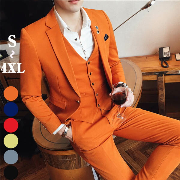 スーツ メンズ スリムスーツ カジュアル ステージ衣装 カラオケ 大会 大きいサイズ シングル 紳士服 ベスト付き 細身 結婚式 メンズスーツ お洒落 韓国 フォーマル 男性 背広 長袖 花婿スーツ 3点セット 2XL 3XL 4XL 青 黒 赤 黄色 オレンジ グレー dg465d3d3g5