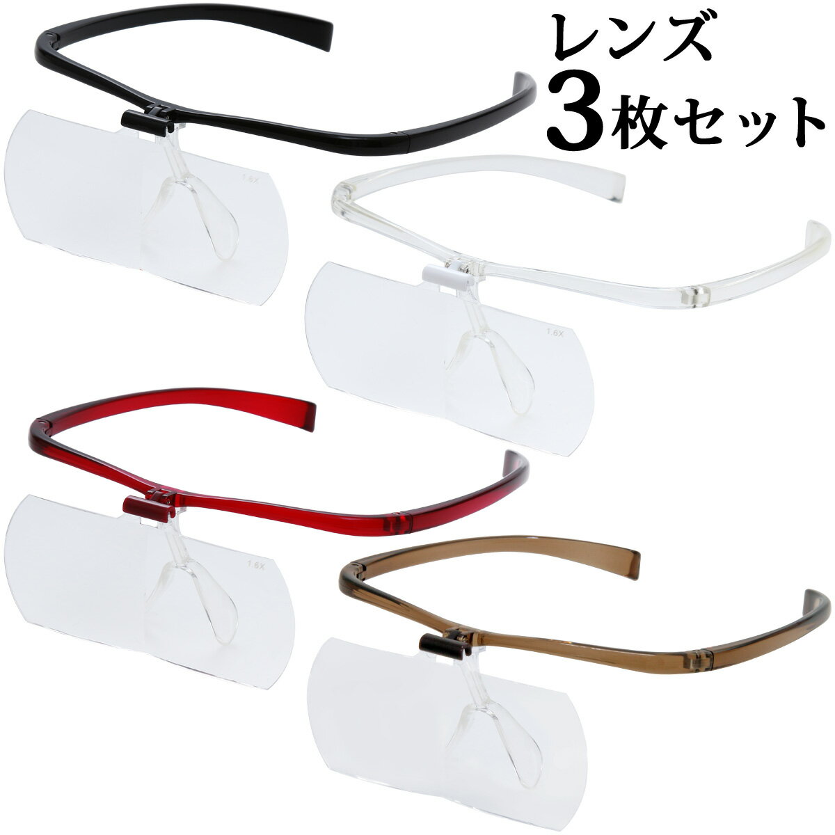 双眼メガネルーペ メガネタイプ 1.6倍 2倍 2.3倍 レンズ3枚セット HF-61DEF メガネ型ルーペ 跳ね上げ メガネの上から クリアルーペ 手芸 拡大鏡 まつげエクステ まつげエクステ 池田レンズ アウトレット スペックレンズ倍率1.6倍、2倍、2.3倍材質レンズ/1.6倍、2倍/アクリル、2.3倍/ポリカーボネートフレーム/TR-90 作動距離(約) 1.6倍:220~350mm(個人差があります) 2倍:120~170mm(個人差があります) 2.3倍:110~170mm(※個人差があります) レンズ寸法45×110mmフレーム色ブラック、クリア、ワインレッド、ブラウン 重量(約) 1.6倍:31g(フレーム:15g/レンズ:16g) 2倍:34g(フレーム:15g/レンズ:19g)2.3倍:41g(フレーム:15g/レンズ:26g)付属品ソフトケース、レンズクロス 意匠登録 第1441967号 商標登録 第5489316号 ルーペスタジオ ※仕様及び外観は改善のため、予告なく変更することがあります。