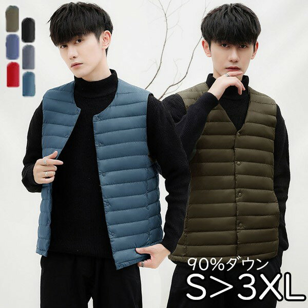 メンズ ダウンベスト Vネックにも出来る 収納袋付き 軽量 インナーダウン 6色 s-4L ダウンジャケット 防寒 作業着 登山 キャンプ アウトドア ゴルフ スキー スノボー 冬春 ライトダウン 暖かい