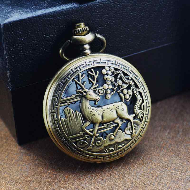 懐中時計 ユニセックス レトロ スケルトン クォーツ フリップカバー 鹿デザイン ペンダントウォッチ ビッグフェイス 男女兼用 アンティークゴールド カジュアル アクセサリー(x2)