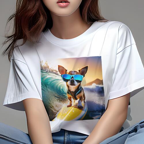 チワワ Tシャツ レディース 犬ファン 半袖 春夏 犬柄 プリント カジュアル かわいい 人間用 個性派 ここだけのデザイン 面白 サングラス チワワ サーフィン 波 海