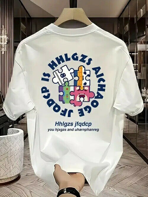 200gの白いTシャツは、背中にカラフルなジグソーパターンがあり、その下に文字といくつかの文字の組み合わせで囲まれている。アメリカン・ヒップ・カップルのスタイルで、厚手のコットン生地、ルーズフィット、夏の着用に適している。
