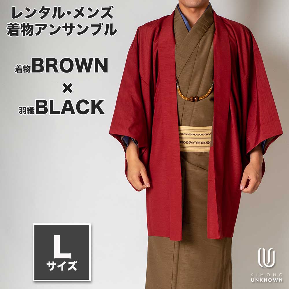 往復送料弊社負担 【レンタル】メンズ着物アンサンブル【対応身長170cm~180cm】【 Lサイズ】フルセットー着物ブラウン×羽織レッド 着流し 羽織 パパ着物 父親 春 秋 冬 着付け簡単 おしゃれ着 カジュアル 貸衣装 レンタル衣裳 七五三 お正月 初詣 旅行 食事会 レン