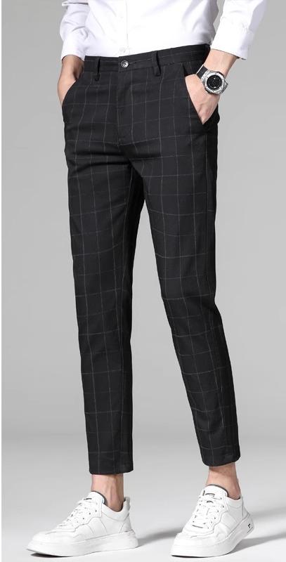 スラックス メンズ パンツ 韓国 夏 薄手 ノータック ストレート 伸縮性 大きいサイズ スリム クロップド ロング オフィス カジュアル シンプル スタイリッシュ 黒 グレー チェック ストライプ