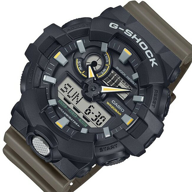 ギフト対応 メーカー希望小売価格はメーカー商品タグに基づいて掲載しています ●【素材:ケース】樹脂/ステンレス ●【素材:ベルト】樹脂 ●【色:ケース】ブラック ●【色:ベルト】ダークグリーン ●【サイズ:ケース】57.5×53.4×18.4(mm) ●【サイズ:ベルト幅】29〜22(mm) ●【重量】75(g) ●【備考】メーカー保証1年付 耐衝撃構造 20気圧防水 フルオートカレンダー タイマー・アラーム・時報 ストップウォッチ ワールドタイム 針退避機能 LEDライト 手首周り:最大約21cm ≪取扱説明書番号"5522"≫カシオ/G-SHOCK【CASIO】 アナデジモデル 1983年の発売以来、飽くなき強さを求めて進化を続けるタフネスウオッチG-SHOCKから、ブラックのケースに人気の高いオリーブグリーンを採用した、Two tone utility colorsです。