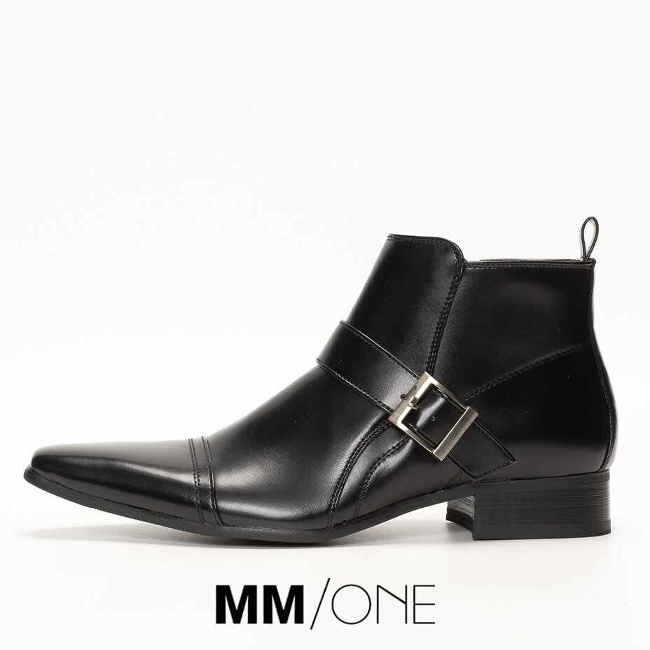 ショートブーツ 黒 メンズ ビジネスブーツ ヒール ビジネスシューズ おしゃれ サイドジップ サイドベルト ブランド MM/ONE エムエムワン カジュアル フォーマル 革靴 皮靴 結婚式 新郎 冠婚葬祭 ロングノーズ ストレートチップ ブラック 2025 秋 秋冬 冬