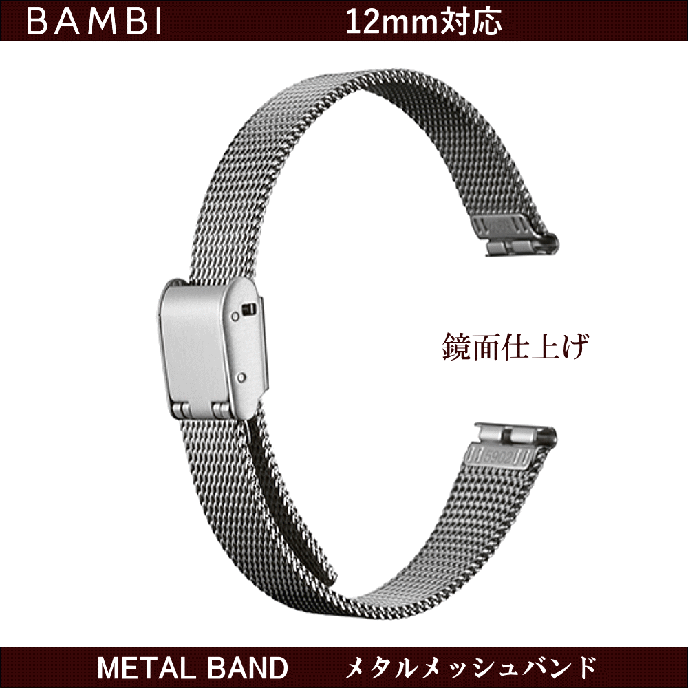 バネ棒無料サービス ウォッチ用 腕時計用 メタルバンド 自分で調節可能 フリーサイズ BAMBI バンビ社製 対応サイズ:12mm カラー:シルバー 鏡面仕上 ミラー仕上 メッシュバンド 交換バンド 交換ベルト 金属バンド レディースサイズ 女性用サイズ ステンレス製