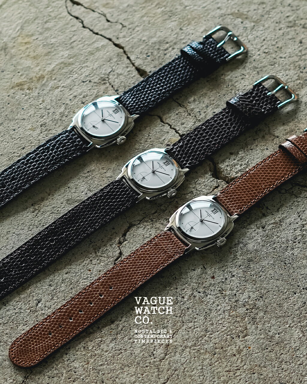 ミッドセンチュリー期のドレスウォッチをモダンにリデザイン VAGUE WATCH Co. / ヴァーグウォッチカンパニー「 Coussin Sophie Dress Lizard 」 時計本体に対して極端なまでに幅を広くデザインし、素材にはリザードを贅沢に使用して"ドレスリザード"と名付けられたベルトを採用。