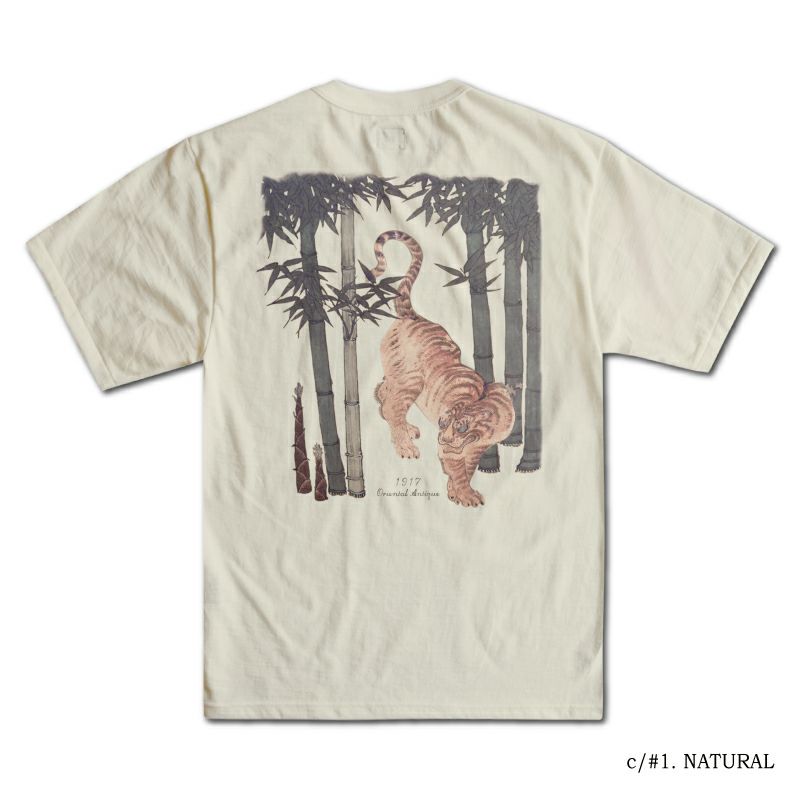 ガス焼き天竺の7ozTシャツによるオリエンタルアンティークデザイン「竹虎」 和歌山の旧式吊編機により、ゆっくり空気を含みながら編み上げたオリジナルの丸胴生地。
