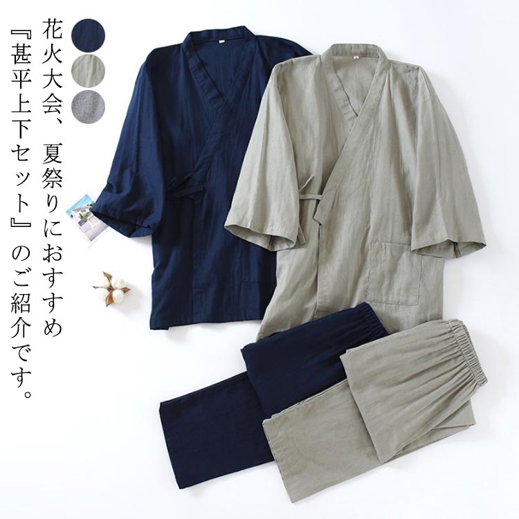 春夏 パジャマ 上下セット 七分袖 長ズボン 甚平 浴衣 メンズ パジャマ 前開き 綿 100 無地 おしゃれ 作務衣 ルームウエア ナイトウエア 薄手 大きいサイズ M L XL グレー ネイビー 紺 吸水 速乾 通気性 敬老の日 プレゼント 実用的 父 祖父